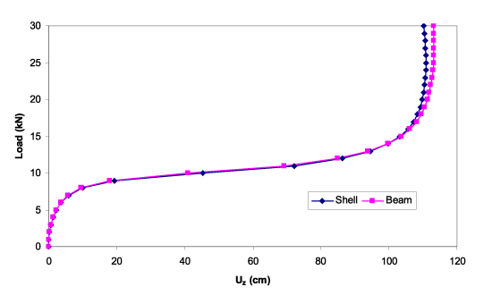 図5,6は、ワーピングビーム要素とMITC4シェル要素を用いたY方向荷重時の荷重-変位曲線です。両者の解は極めてよく一致しています。