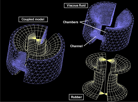 図1に液封マウントの異なる流体と構造の有限要素モデルを示します。