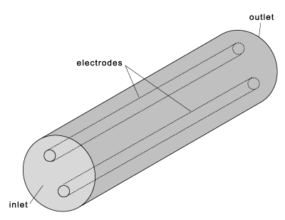 図5、特性の極端に異なる材料界面問題:H、ADNAの結果と解析解の比較;実部(左図) と虚部(右図) Electromagnetically induced mixing of glass melt in a pipe パイプ内のガラス溶解中の電磁誘導 これは、電磁解が誘導されるマルチフィジクスと混合の問題になります。 電磁駆動のパイプミキサー内の移流混合を計算するために、ADINA-EMのA-φ法とADINA CFDの 手法を用い、連成させています。 この問題の概略を下の図6に示します。 この例題は、一方で外部に一定の磁界をかけて全体を構成している中で導電する流体に浸されてい る2本の電線間が時間で変化する電圧によって現れるローレンツ力で攪拌される円筒管内に流体が 流れます。 面内のローレンツ力による流れ方向に対する垂直な面で攪拌がおきます。